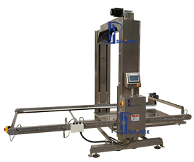 人工用地牛將整托盤空罐運至指定位置(碼垛方式為罐口向上),點動啟動按鈕,系統(tǒng)會自動通過光電檢測確定空罐托盤高度,根據(jù)后面緩存皮帶對罐子的需求,將一層空罐通過刮板推至緩存面板上,然后再調(diào)整上下高度與后道的緩存皮帶進行高度對接,再將空罐送至緩存皮帶上待用